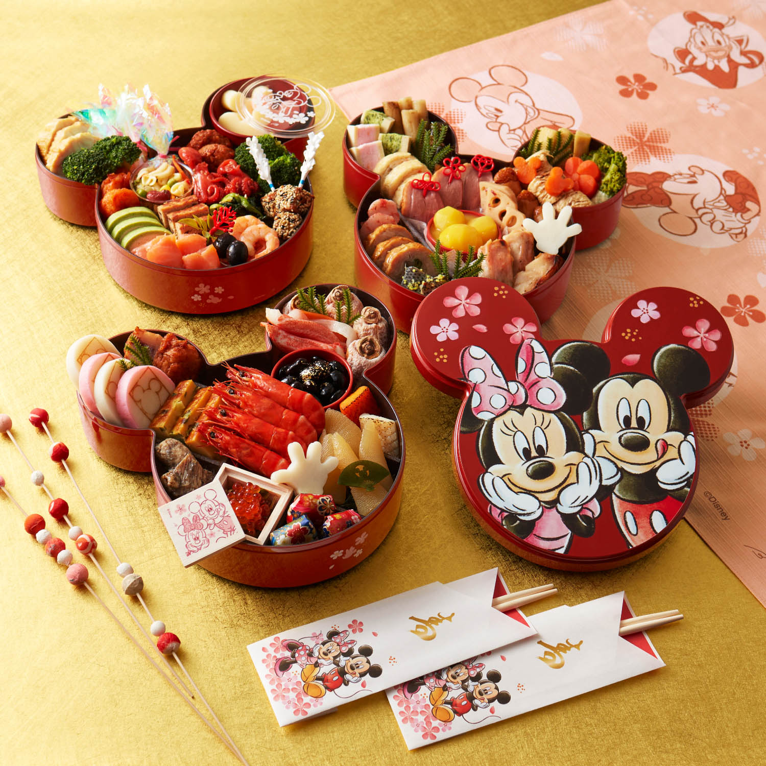 重箱には、ミッキーとミニー、ドナルドとデイジーが描かれたイラストがデザインされています。