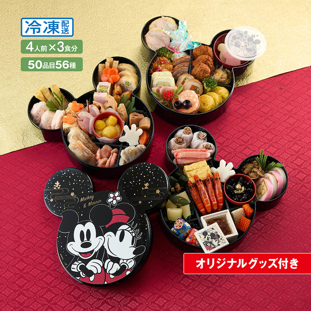 『おせち・三段重「ミッキー&ミニー」』は、4人×3食分で、50品目56種が入っています。